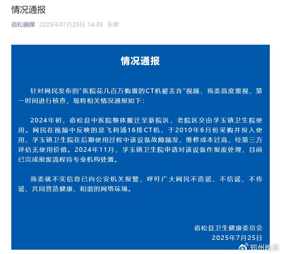 针对网民发布的“医院花几百万购置的CT机被丢弃”视频,安徽省安庆市宿松县卫健委7月25日通报:使用15年故障频发,维修成本过高,去年11月已申请报废处理,等专业机构处置。