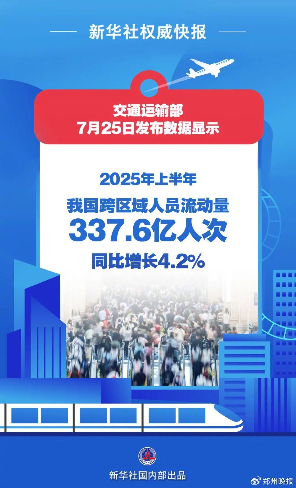 2025年上半年,我国跨区域人员流动量337.6亿人次,同比增长4.2%,完成营业性货运量280.3亿吨,同比增长3.9%,完成港口货物吞吐量89亿吨,同比增长4%,完成交通固定资产投资16474亿元,行业经济运行总体平稳、稳中有进。