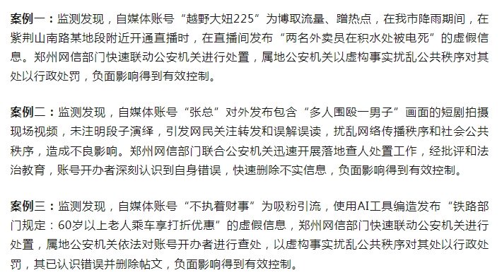 为深入推进“清朗·系列”专项行动,强化“自媒体”治理工作,郑州网信、公安等部门强化联动,依法依规查处一批违法违规“自媒体”账号。现向社会公开通报3起典型案例如下: