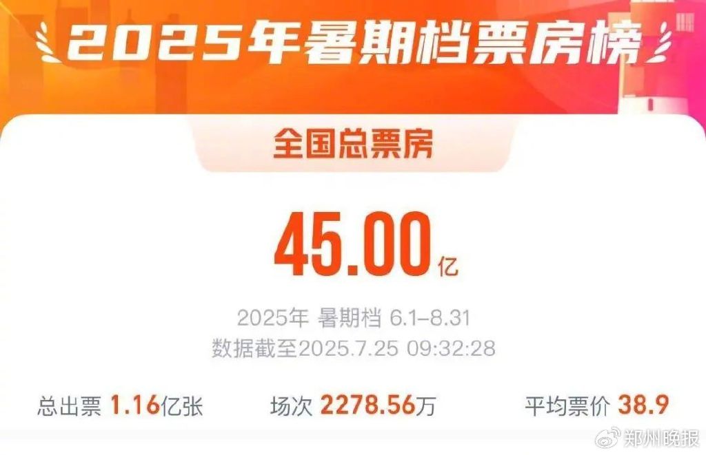 据网络平台,截至7月25日09时30分,2025年暑期档(6月—8月)总票房(含预售)突破45亿。